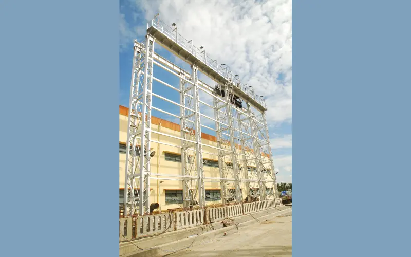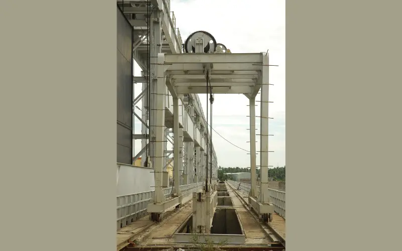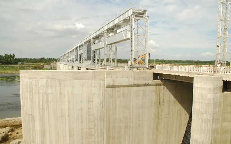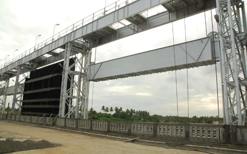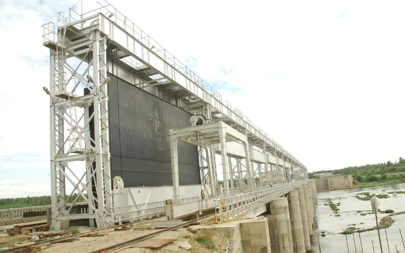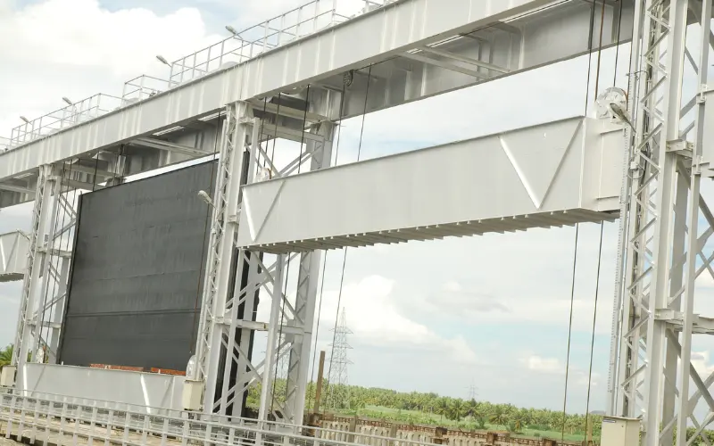 Details of Gates: 15.0 x 10.0 Mtrs Regulator Gates with Moving Gantry crane – 18 Nos, 15.0 x 10.0 Mtrs Stoplog Gates with Moving Gantry crane – 2 Nos, 12.0 x 27.0 Mtrs Trash Rack, 5.7 x 16.0 Mtrs Intake Gates – 4 Nos, 12.4 x 9.0 Mtrs Draft Tube Gates – 2 Nos